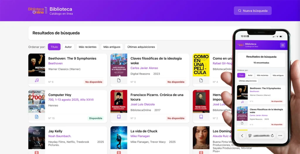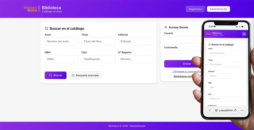 BibliotecaOnline centraliza préstamos, usuarios, catálogo e informes en una sola plataforma web. Funciona para centros educativos, administraciones públicas y bibliotecas privadas o familiares.